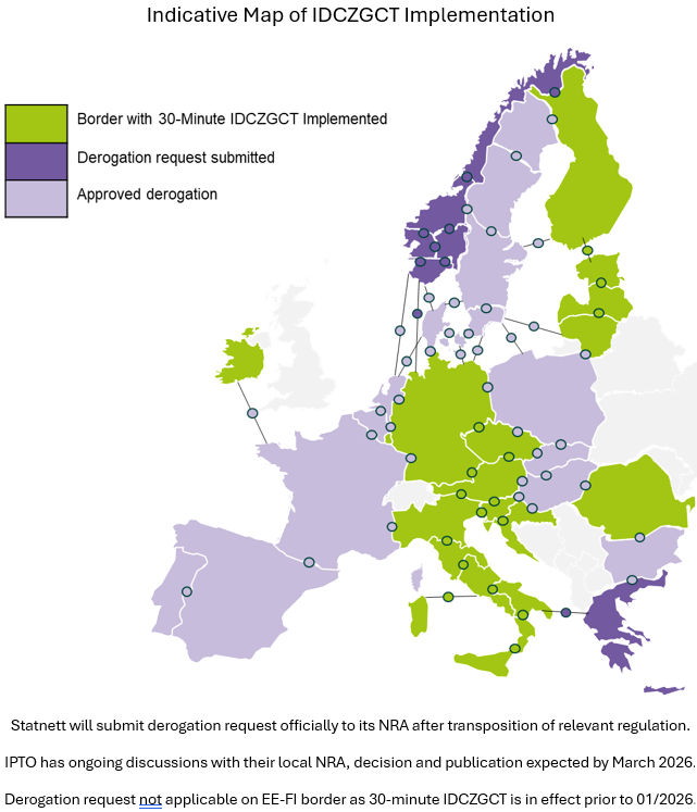 On 14 January 2026, the first window of European borders went live. The transition will continue gradually, with the remaining borders joining in over the next years. By 2029, most European borders are expected to apply the 30‑minute IDCZGCT. The latest status on the implementation is available in the “Border‑Based Overview for 30‑Minute IDCZGCT Derogations”, maintained on a regular basis.